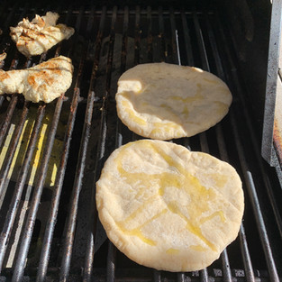 If you're also grilling lemons, place the lemons cut side down over medium heat for 2-3 minutes until grill marks appear. Grilling the lemons is supposed to mellow out the flavor a little bit, and give it a little bit of sweetness so it's worth taking the time to do this. Whenever I make this chicken, I also quickly grill a few bell peppers and onions to go with it, just enough to bring out a little flavor but still keep the vegetables crisp. Brush the vegetables with a little olive oil and grill over medium heat for about 3-4 minutes. I also like to grill my pita bread while I'm at it.