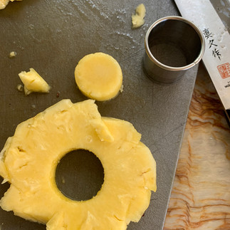 If you can find some good pre-cut pineapples, by all means save yourself some time and skip to the grilling section below. Otherwise, here's how my dad taught me to do this. First, cut the top and bottoms off so you can stand the pineapple up flat on your cutting board. Then thinly slice the skin off in small sections, leaving behind the little "eyes." The outer section of the flesh is apparently the sweetest, so try to minimize the amount you take off here. Now cut out the "eyes" that remain. See how they sort of line up diagonally? Find a diagonal section, and cut a V-shaped wedge out to remove the eyes. Do this all around. I'm going to grill these so I cut circular pieces and removed the middle section with a biscuit cutter. If you don't need the pieces to be round, cut down the middle into quarters and cut the middle out that way. I personally really like that middle section but a lot of people find it tough so I usually remove it.