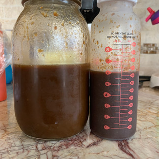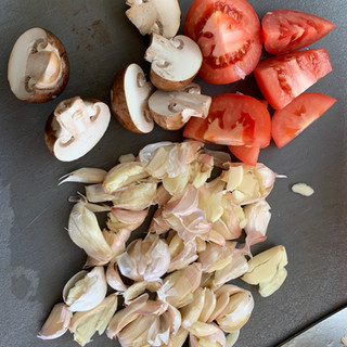 2) Chop the shallots, tomatoes, mushrooms, 2 bulbs of garlic, and ginger very small. If you're fermenting you need to use fresh ingredients, dried alternatives won't work. Place the chopped vegetables in a medium-sized bowl and add the bonito flakes (optional), molasses, black peppercorns, sugar, and whey to the chopped vegetables. This is all the ingredients except for the vinegars, 4 cloves of pressed garlic, and sesame oil. Transfer the mixture to a glass jar (2 pint-sized, or 1 quart-sized jar should work), then add enough water to cover the vegetables and fill the jar, and cover with a fermentation lid and set aside at room temperature (in a cool, dark spot) for about 1 week. In the pictures below, I tried half the sauce with 1/8 teaspoon of potassium chloride (aka salt alternative) to see if that would enhance the flavor or otherwise help but it didn't make any difference.