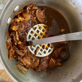 3) Once the fermentation is complete, simmer and strain. I simmered it for about 40 minutes, but next time I make this I'm going to simmer for just 20 minutes to compare flavors. After simmering, proceed to step 6, below. Simmer, strain, and add the vinegars, raw garlic, and sesame oil. For the fermented sauce, I'm partial to just using balsamic vinegar rather than adding sherry vinegar at the end, but that's a matter of preference.