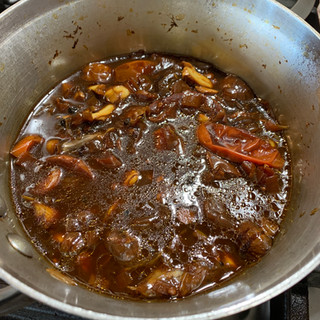 1) In a small sauce pan (mine is 1.5 quarts), combine all the ingredients except for the vinegars, 4 cloves of pressed garlic, and sesame oil. Bring the mixture to a boil and then cover and simmer on low heat for 1 hour, stirring occasionally.